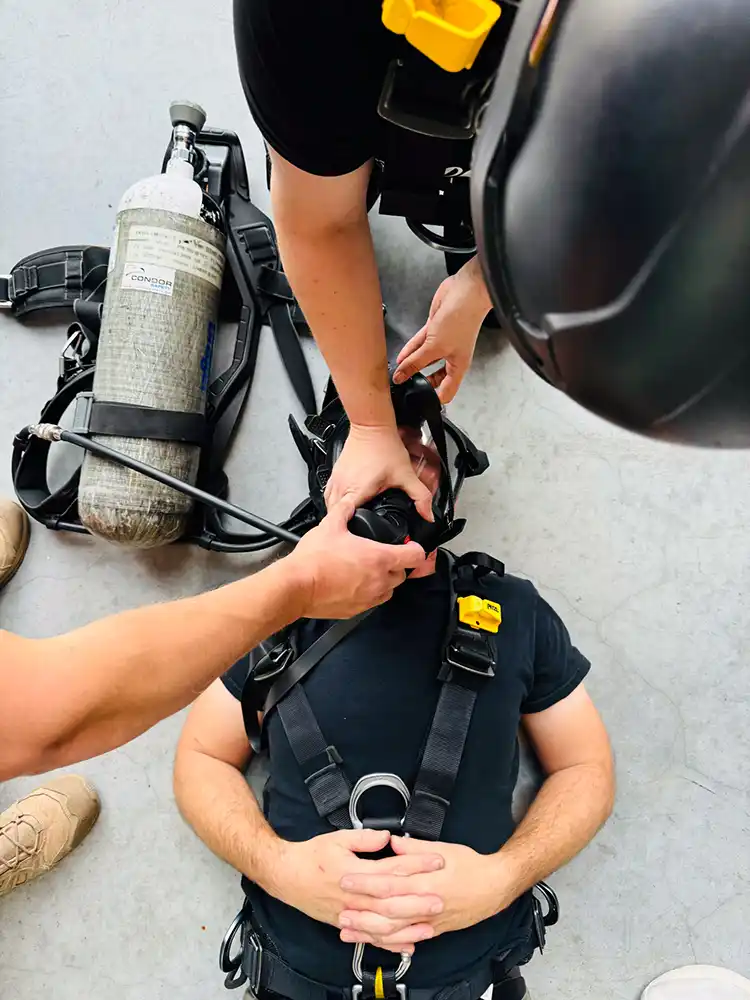 - Onafhankelijke ademlucht wordt ook gebruikt door de veiligheidswacht bij een betreding. Hierdoor kan de veiligheidswacht adequaat handelen in verschillende noodsituaties.